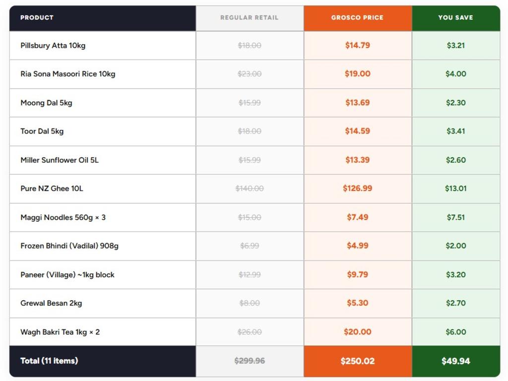 Ačkoli se Grosco prezentuje jako první australský indický velkoobchodní supermarket na bázi členství, nabízí také široký výběr australských a jižních asijských potravin.