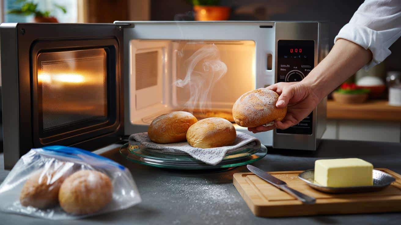 Jeden úspěšný pekař si oblíbil jednoduchý způsob rozmrazování v mikrovlnné troubě bez použití trouby či toustovače. Základem není vysoká teplota, ale řízená vlhkost.