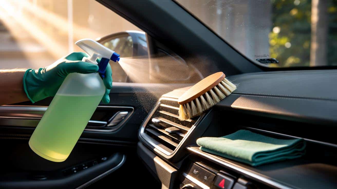 Jak na to přesně: vypněte motor i ventilaci. Připravte si měkký štětec (detailingový, se štětinami z přírodních nebo syntetických materiálů) a enzymový čistič interiéru. Sprejujte přímo na štětiny, ne do štěrbin. Pomocí krátkých, pružných pohybů štětcem jděte po lamelách zleva doprava, pak shora dolů. Měkký kartáč je v čištění ventilace klíčový. Na závěr setřete zbytky čistým mikrovláknem, opakujte podle potřeby. Nakonec nechte ventilaci chvíli běžet na nízký výkon, aby vše vyschlo.