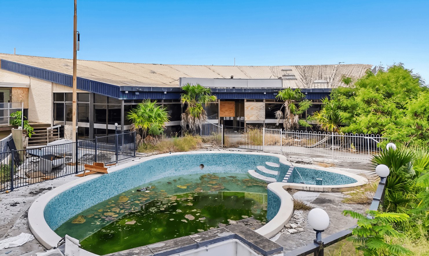 Opustený hotel zahrnuje konferenční centrum a bazén. Foto: realcommercial.com.au/buy